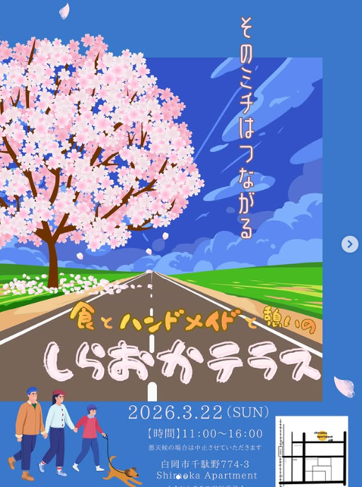 2026.03.01 ご紹介 青空マルシェ「しらおかテラス」開催! 2026年3月22日(日)、白岡市千駄野の「shiraoka apartment」で青空マルシェ「食とハンドメイドと憩いのしらおかテラス」が11:00〜16:00の時間帯で開催されます。